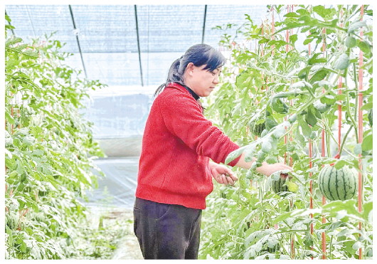 走进柳山镇辛庄村村民曹金香的西瓜大棚,浓浓的绿意扑面而来,清甜的果香萦绕鼻尖,一片生机勃勃的景象。一排排西瓜藤蔓长势旺盛,翠绿的藤蔓间,一个个色泽鲜亮的西瓜错落悬挂。曹金香俯身穿梭在瓜藤间,轻轻拍动瓜身,凭借反馈的声音判断西瓜的成熟度,她脸上的笑容里充满收获的欣喜。