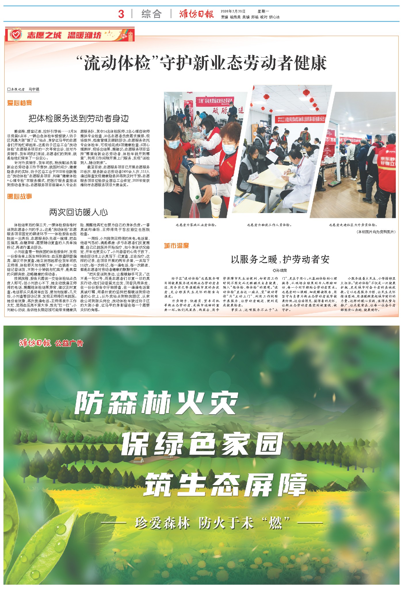 坊子区“流动体检”志愿服务项目将健康服务送到新业态劳动者身边,用务实之举温暖城市里的奔波者,充分彰显民生关怀的精准与温度。