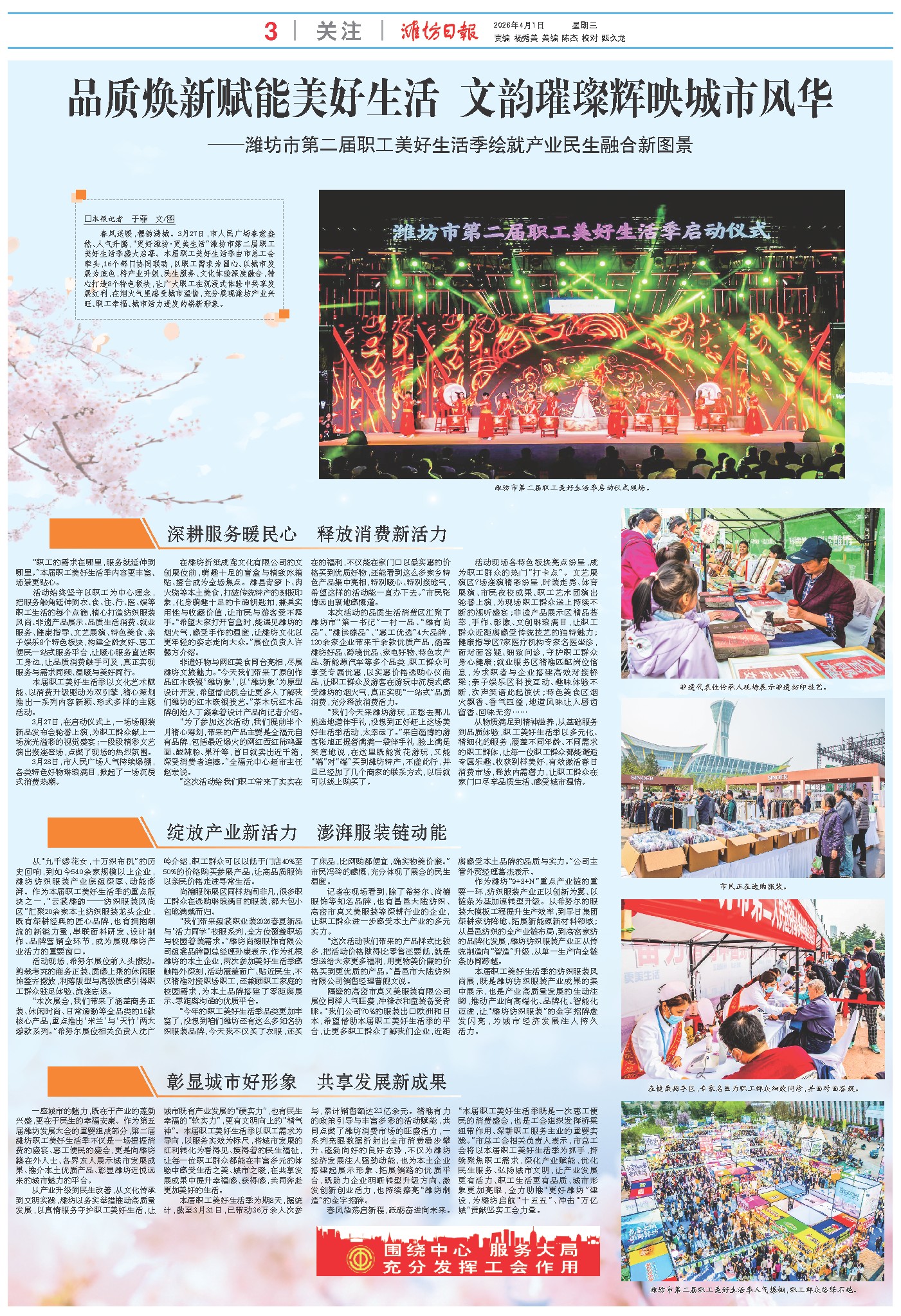 一座城市的魅力,既在于产业的蓬勃兴盛,更在于民生的幸福安康。作为第五届潍坊发展大会的重要组成部分,第二届潍坊职工美好生活季不仅是一场提振消费的盛宴、惠工便民的盛会,更是向潍坊籍在外人士、各界友人展示城市发展成果、推介本土优质产品、彰显潍坊近悦远来的城市魅力的平台。