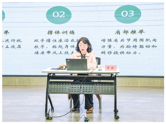 随后,李静结合临床经验,逐一讲解脊柱脊髓损伤、骨折、手外伤等职场常见工伤,摒弃专业术语,将康复规范、护理技巧拆解为“家常话”,让观众听得懂、用得上。她坚持“理论+实操”结合,针对真实案例讲解工伤康复要点,从防护装备佩戴到日常姿势调整,细节讲解细致入微;同时演示简单家庭康复动作,强调康复训练的循序渐进、无痛原则,提醒需在专业指导下进行,避免二次伤害,并着重强调“预防优先、科学康复、全程干预”的原则。