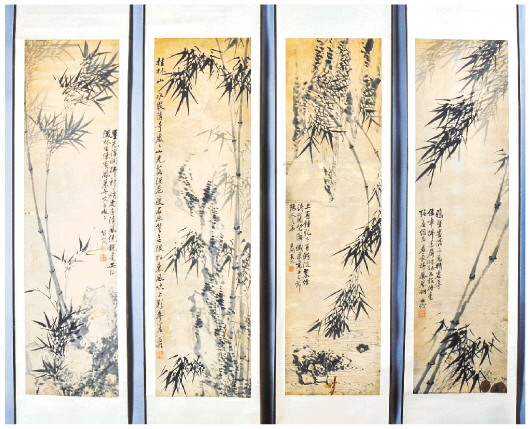 在众多的墨竹图中,四条屏是很多人喜爱的绘画形式。黄玉柱的四屏墨竹图笔墨丰满,浓淡交融,别有意趣,细看竹竿挺拔有力,气韵连贯,竹叶疏密有致,浑厚苍润。笔未到处,意先行,气韵足。