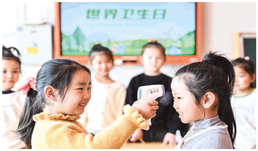 4月7日,在山东省滕州市西岗镇中心幼儿园,小朋友体验测量体温。