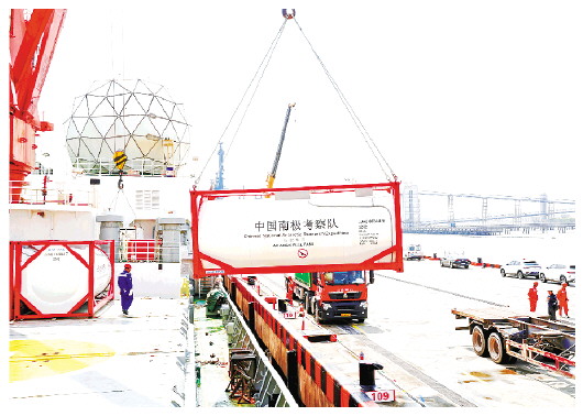 4月9日,工作人员操作机械从“雪龙”号上卸货。4月9日,历时160天、航程3.4万余海里,执行中国第42次南极考察的“雪龙”号,凯旋归国。550名队员、常规物资补给量超3600吨、内陆考察104天,人员规模和任务量等再创新高;热水钻探刷新世界纪录,国产新装备挺立极寒……这支队伍交出一份中国极地探索能力跃升的答卷。 (新华社发)