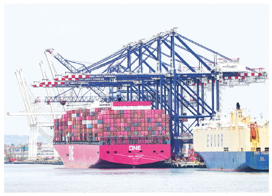 这是4月15日在美国纽约拍摄的纽约和新泽西港一个集装箱码头。纽约和新泽西港是美国东北部最大的贸易和货物进出口中心。