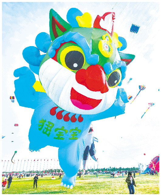 4月16日,潍坊风筝大赛上放飞的“峱宝宝”。记者 张驰 摄
