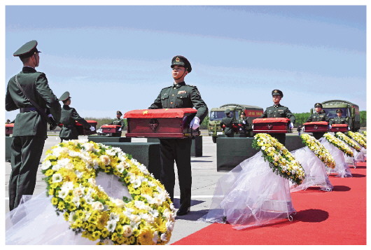 4月22日,第十三批在韩中国人民志愿军烈士遗骸由中国空军运-20B从韩国接回辽宁沈阳,12位志愿军烈士英灵及146件遗物回到祖国怀抱。这是迎回仪式上,礼兵手捧覆盖着五星红旗的志愿军烈士遗骸棺椁。